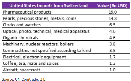 Aucun accord n’a pu être finalisé et les nouvelles surtaxes américaines, significativement supérieures aux attentes, sont entrées en vigueur le 7 août frappant environ 60% des exportations suisses vers les Etats-Unis. L’industrie horlogère, la chocolaterie et la machinerie étaient les principaux secteurs concernés (voir graphique) avec un impact négatif potentiel sur la croissance du pays estimé entre 0,3% et 1% selon les scénarios…jusqu’au 1er octobre !