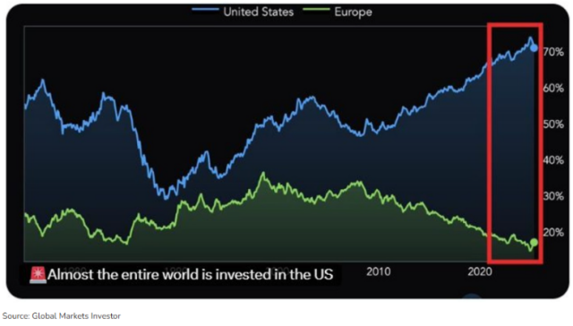 Les actions américaines dominent toujours les marchés mondiaux, représentant environ 70 % de la capitalisation boursière totale contre seulement 18 % pour l’Europe. Cette concentration reflète la suprématie des méga-capitalisations américaines. Toutefois, les incertitudes politiques, la dette élevée et la faiblesse du dollar pourraient fragiliser cette position et encourager un déplacement des capitaux vers les marchés étrangers, prolongeant ainsi la « grande rotation » en faveur du reste du monde.